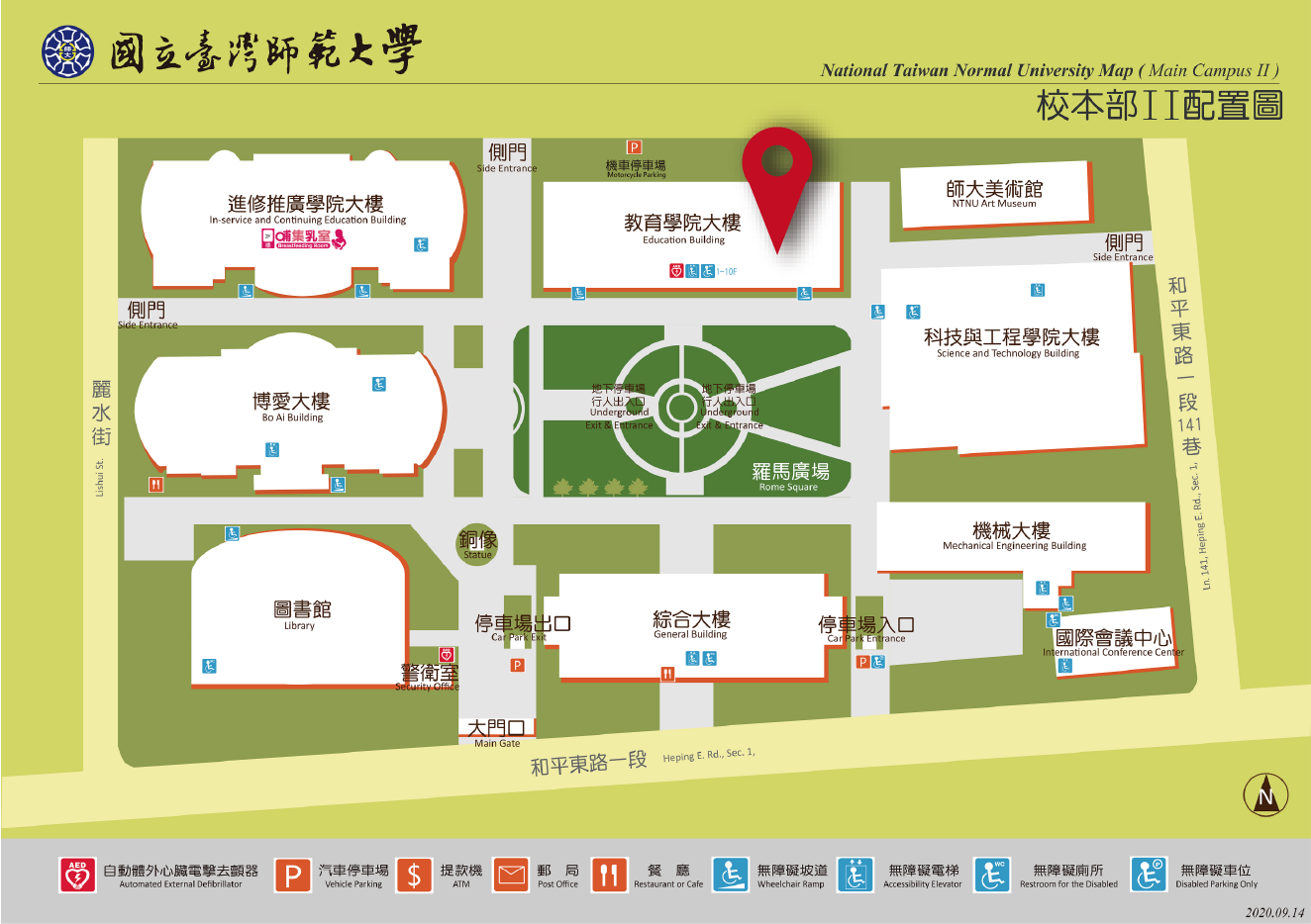 - 北二高:木柵交流道->辛亥路- >右轉羅斯福路->右轉和平東路- >臺灣師大校本部。